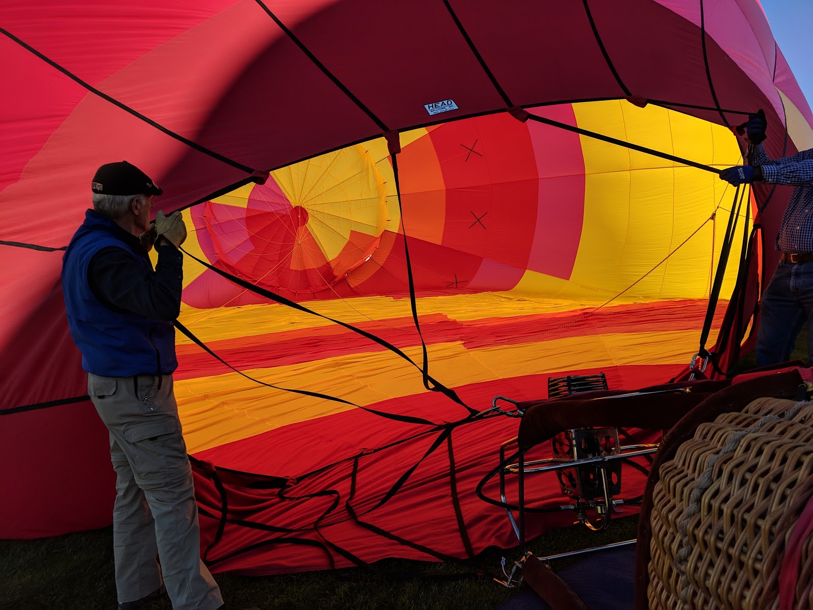 The basket gets slid off the back of the trailer along with the envelope (that holds the balloon) and the fan. I was on the fan most days which I don't mind. It's fun to watch the balloon inflate! It's so pretty on the inside!